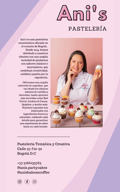 Soy Diana Marcela Rincón, administradora de empresas y creadora de Ani's. Desde 2014, inspirada por mi Nana y mis tres hijas, emprendí en repostería. Comenzamos con Ani's Party & Cakes, iniciando con cupcakes y tortas, pero con el apoyo de familiares y amigos, creció nuestra oferta con galletas, brownies y más. En 2022, cumplimos el sueño de abrir "Ani's Bakes N Coffee", una tienda donde nuestros clientes pueden disfrutar de nuestros productos y una agradable compañía.