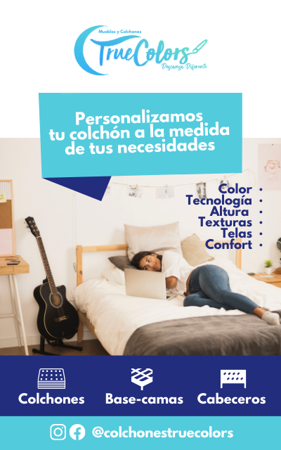Colchones TrueColors, una marca que nace de la pasión y experiencia de más de 20 años en el sector de dos esposos ingenieros, quienes con un equipo de colaboradores altamente selectos crean productos personalizados para el descanso, que se adaptan a las necesidades, el confort y los gustos de cada cliente. Entre una variedad de colchones, cabeceros, base-camas, muebles y accesorios, con excelente tecnología, TrueColors ofrece precios justos y un eficiente soporte logístico y postventa.