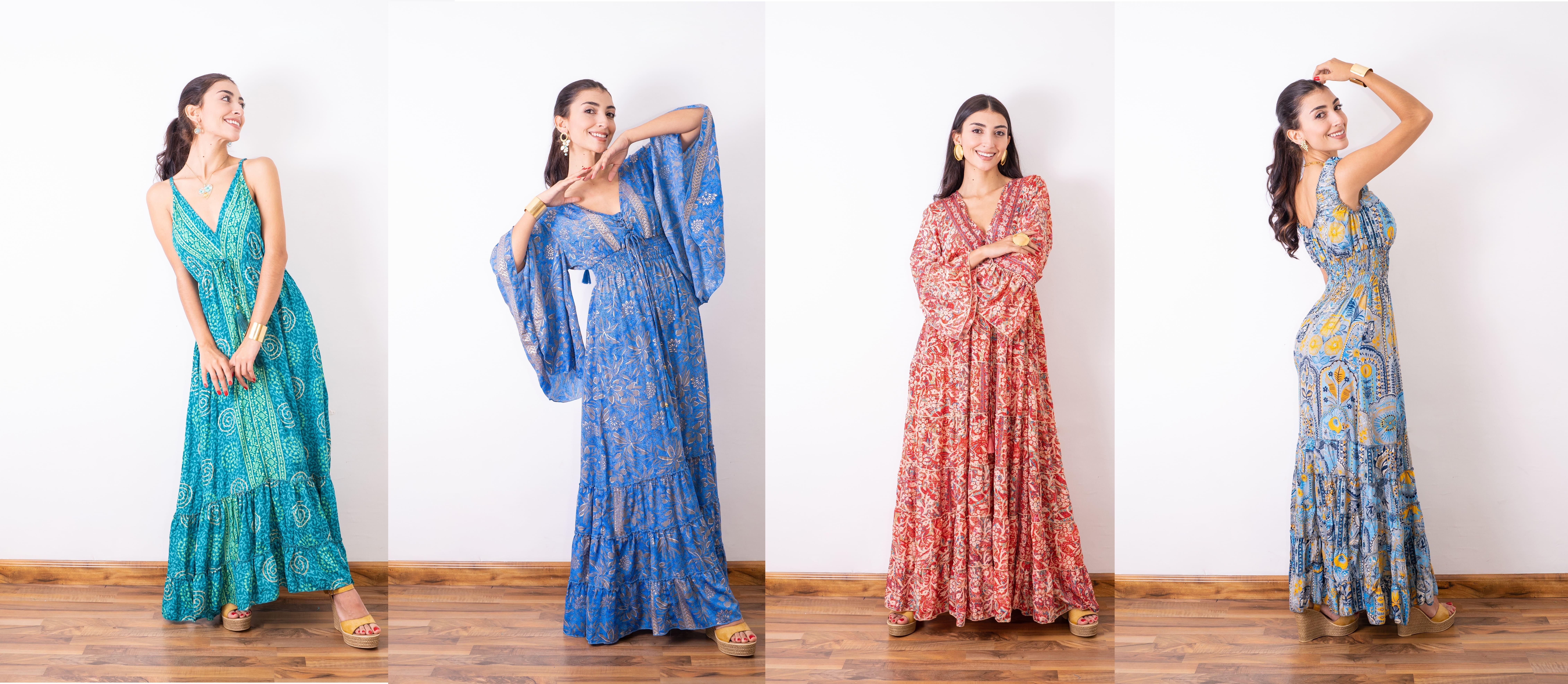 Variedad de prendas de mujer importadas desde India, seleccionadas con amor para todas las mujeres colombianas, encuentra: Vestidos Largos, Faldas, Pantalones, Blusas, Bolsos y Accesorios. Son elaborados en seda 80% y rayon 20%